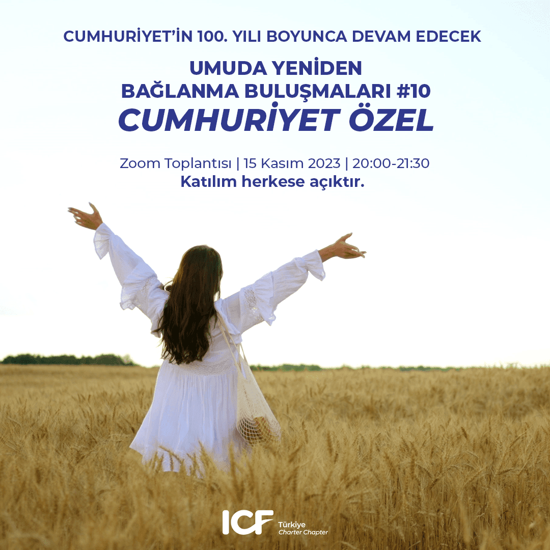 Umuda Yeniden Bağlanma buluşmalarımıza 10. su ile devam ediyoruz. Cumhuriyet’imizin 100.yıl kutlamalarına devam ettiğimiz bu anlamlı günlerde Umuda Yeniden Bağlanma buluşmamızı “Cumhuriyet Özel” olarak tasarladık. Mustafa Kemal Atatürk’ün “Umutsuz durumlar yoktur, umutsuz insanlar vardır. Ben hiç bir zaman umudumu kaybetmedim” sözü buluşmamızın hareket noktası olacak. Sizleri Cumhuriyet’imizin 100.yılını bir de aktif umut felsefesi ile deneyimlemeye davet ediyoruz.